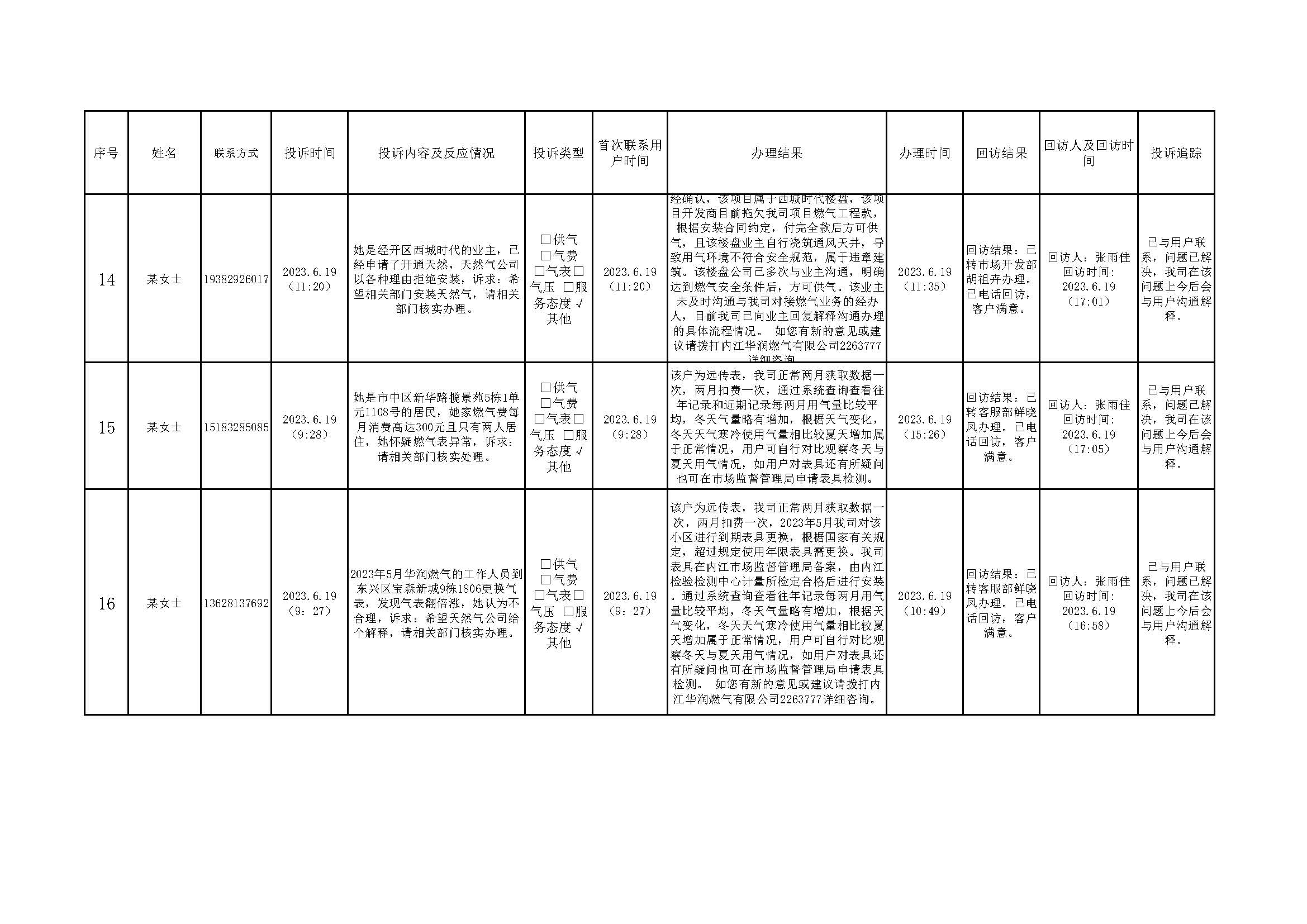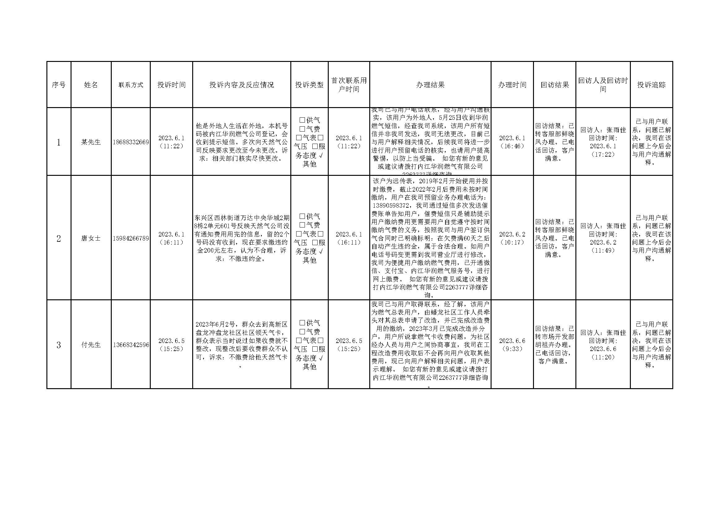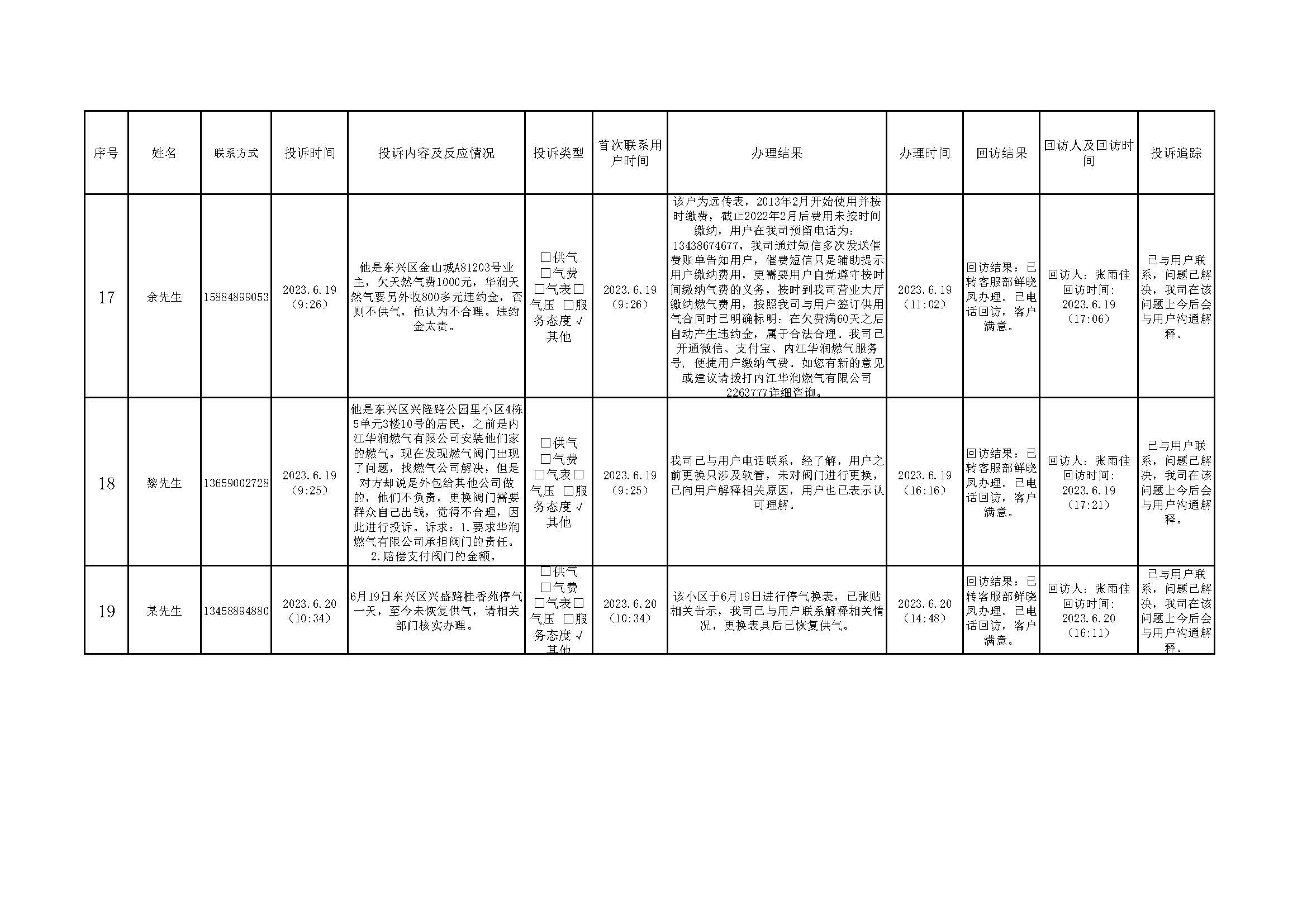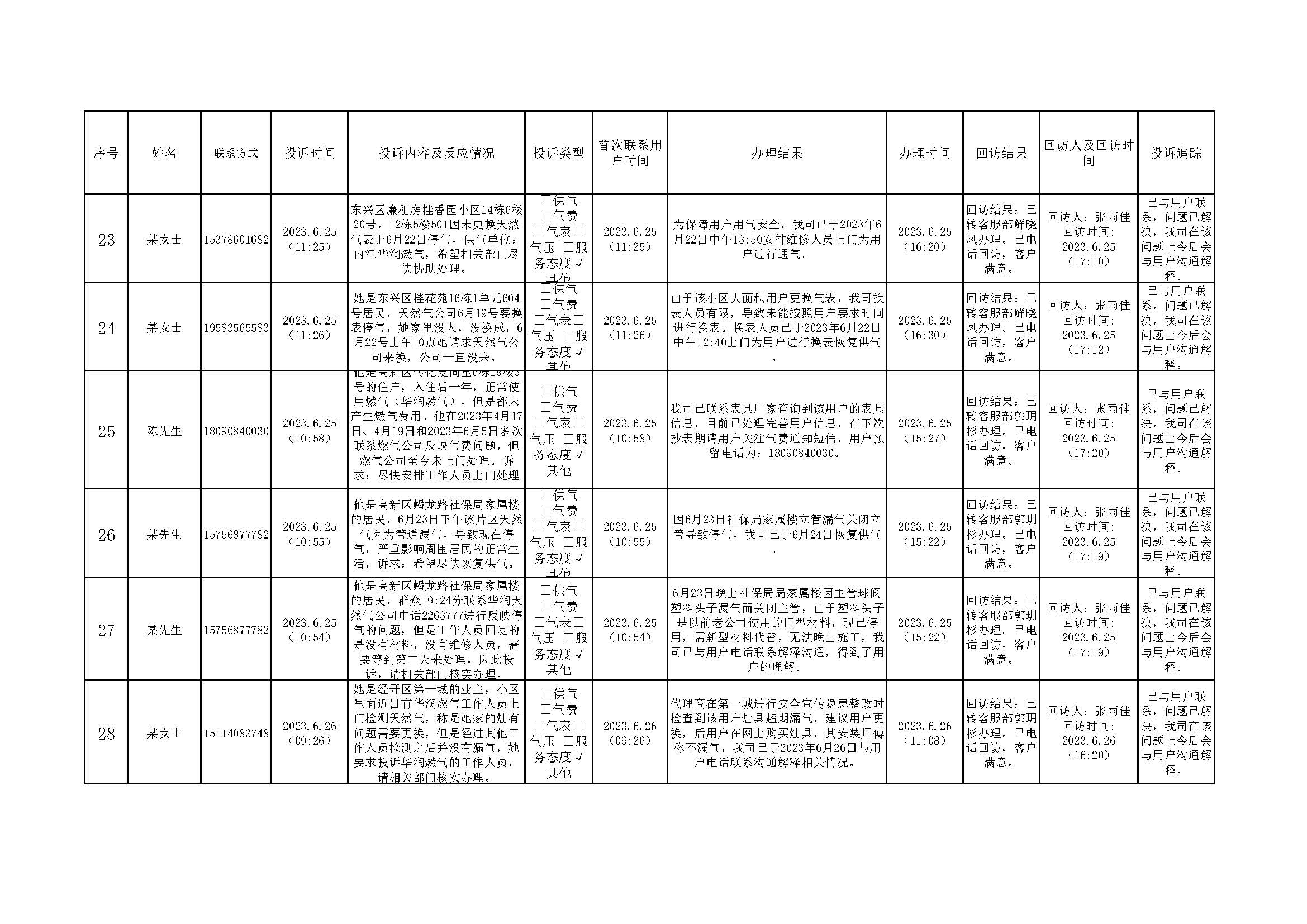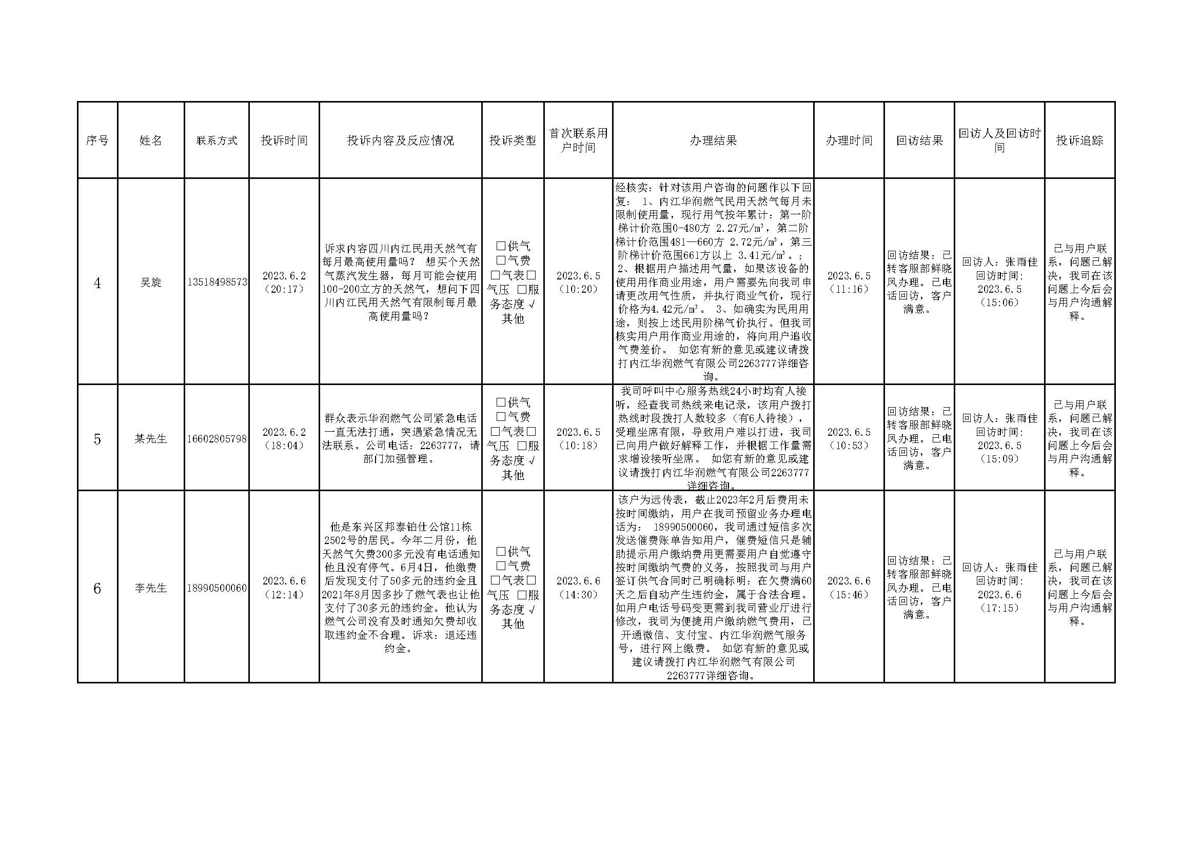 2023年6月投訴辦理及回訪情況