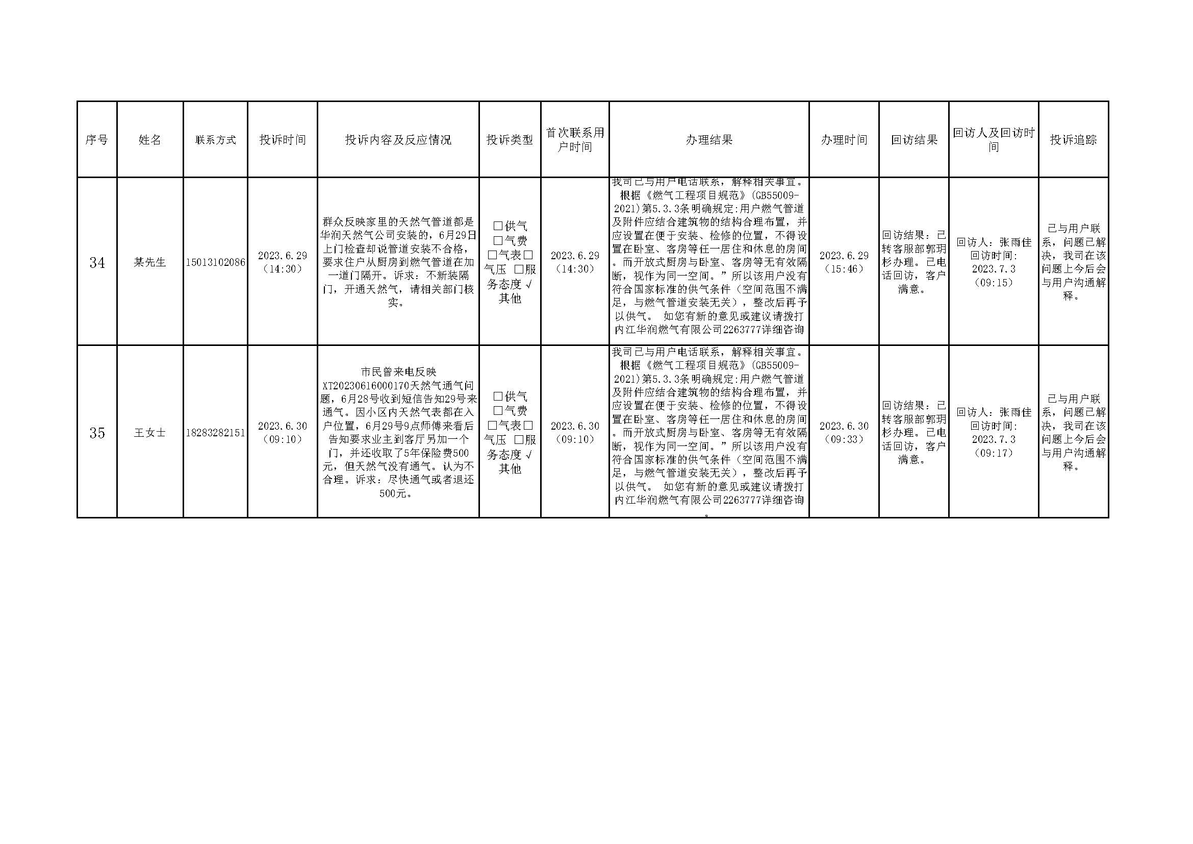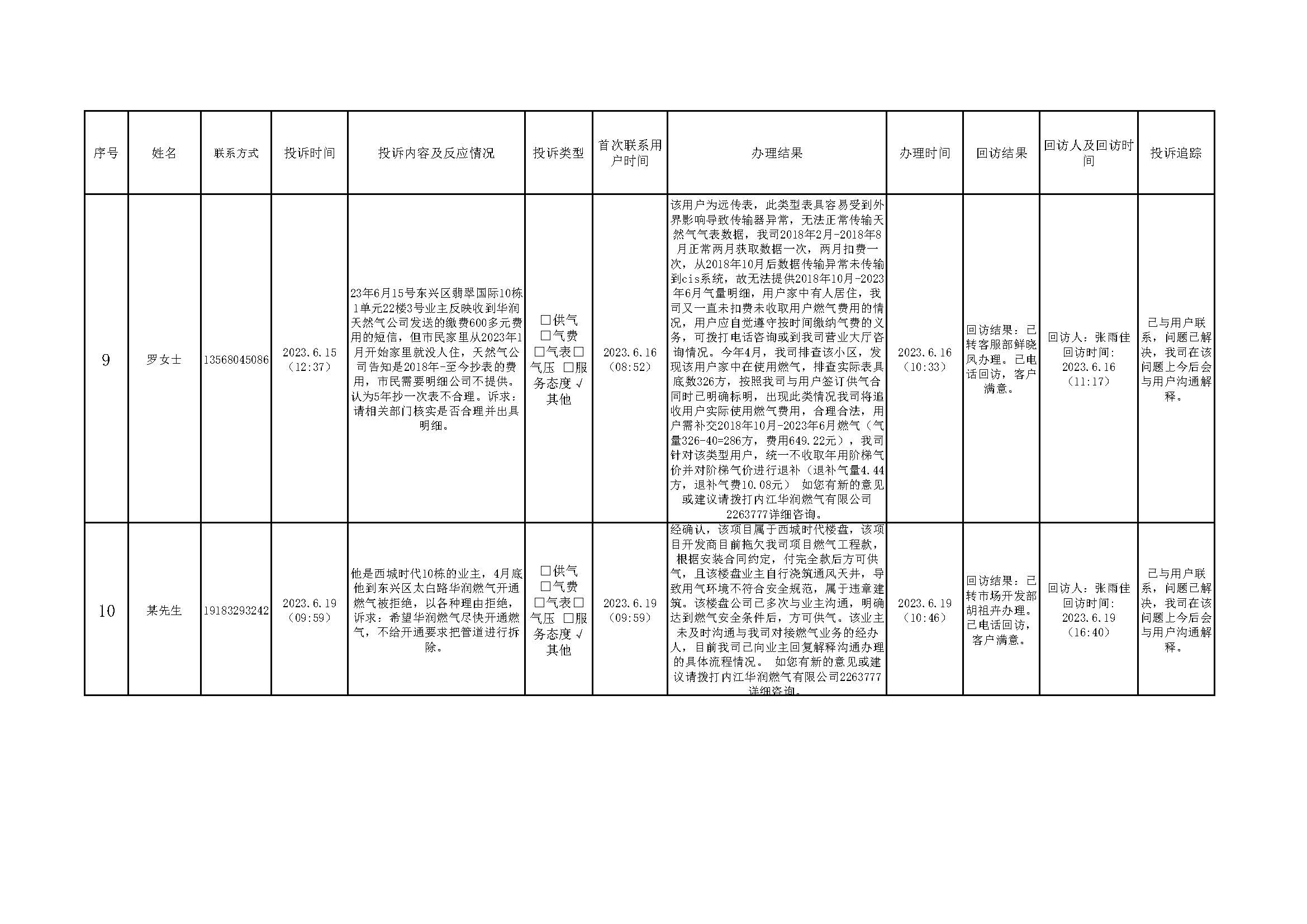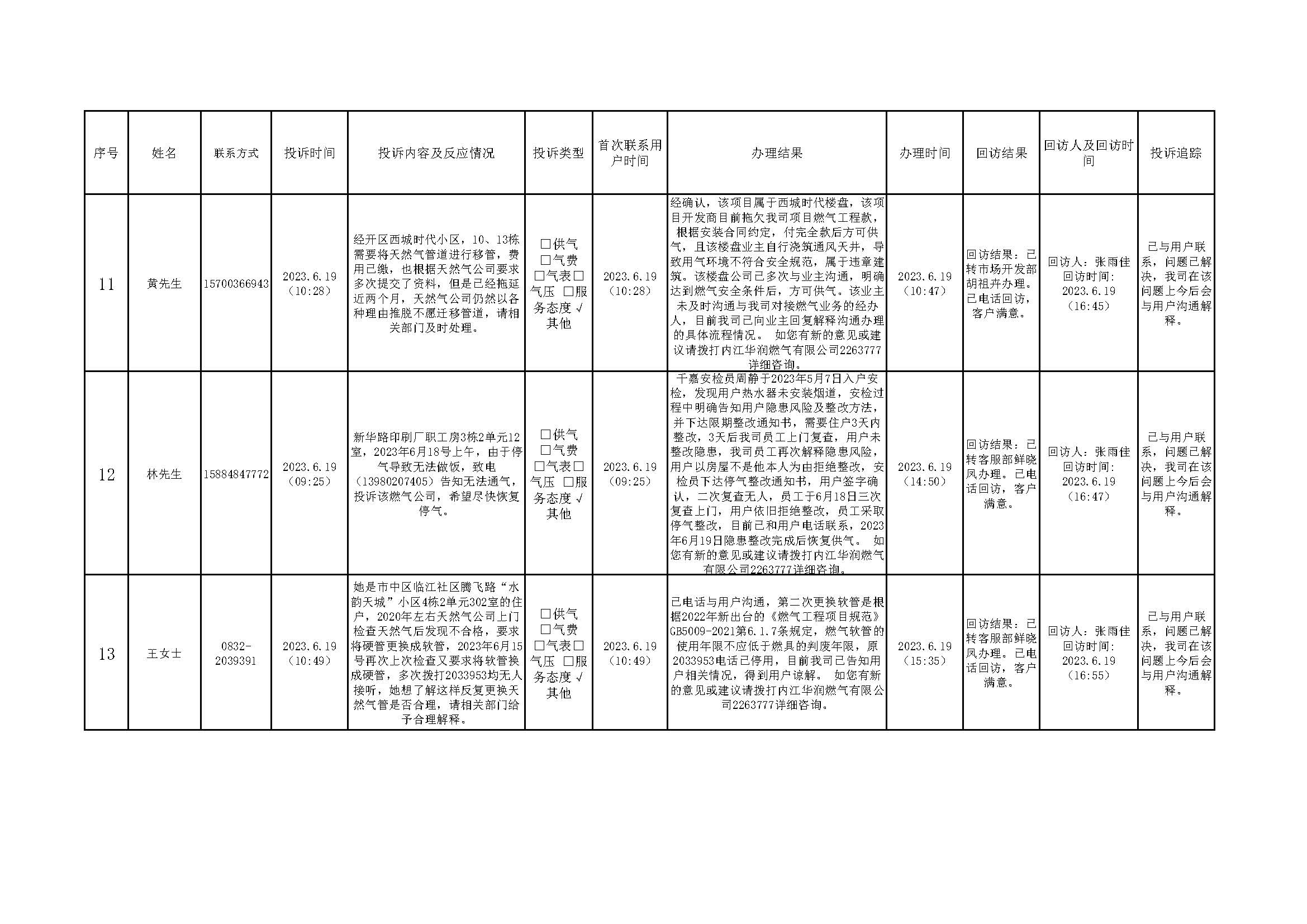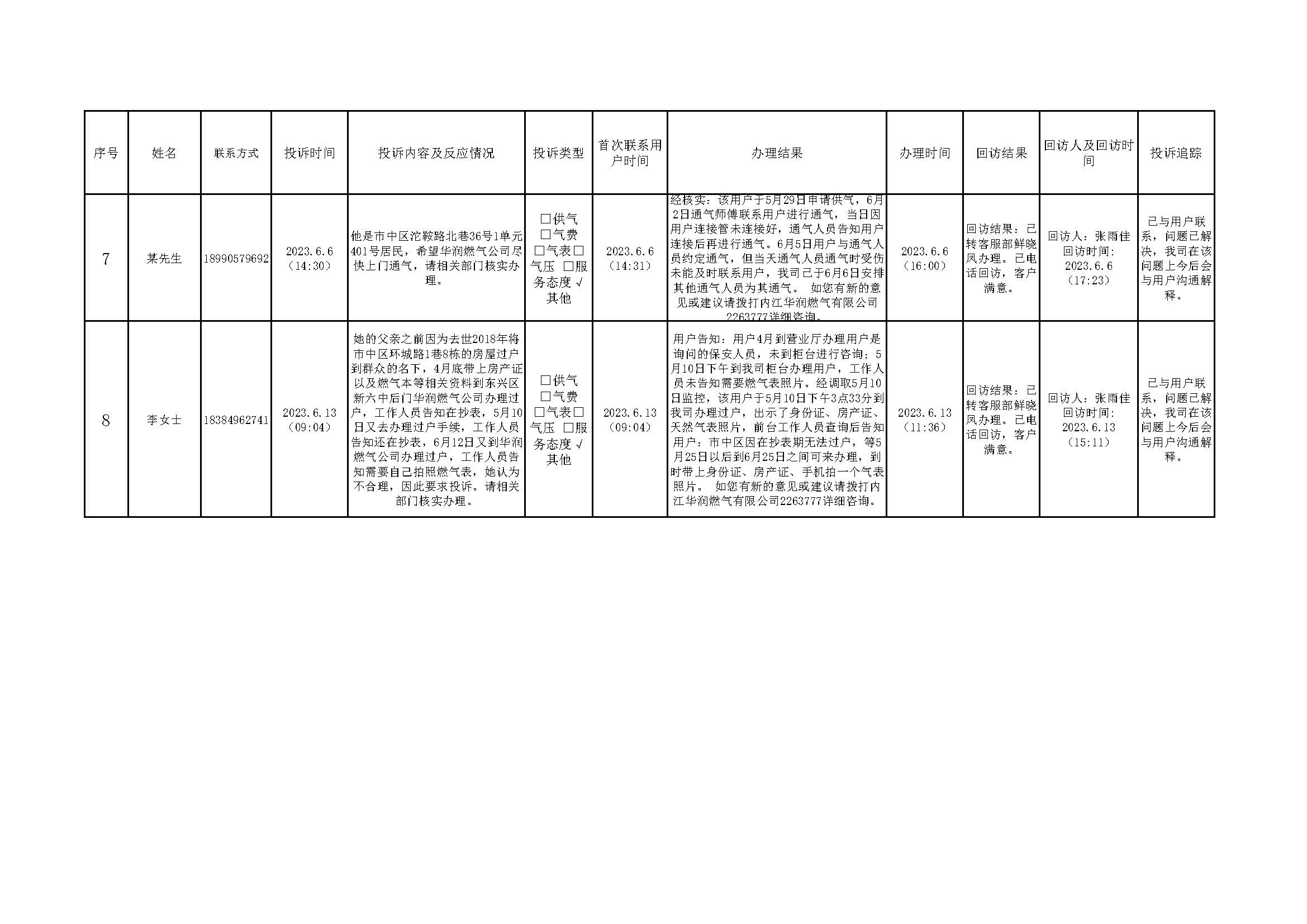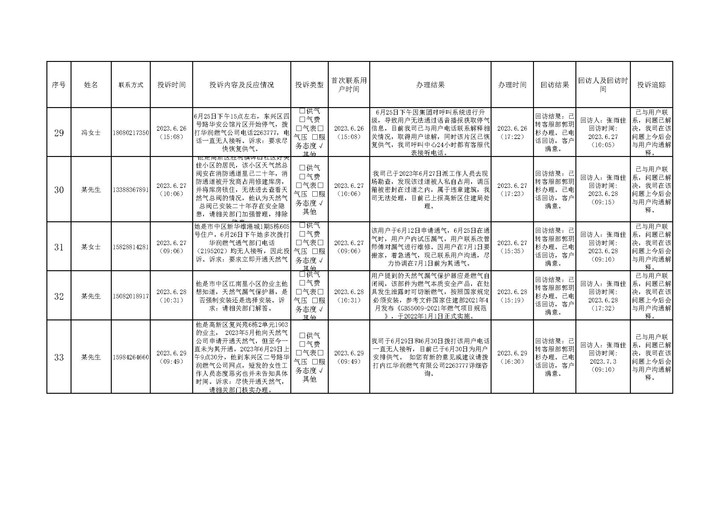 2023年6月投訴辦理及回訪情況