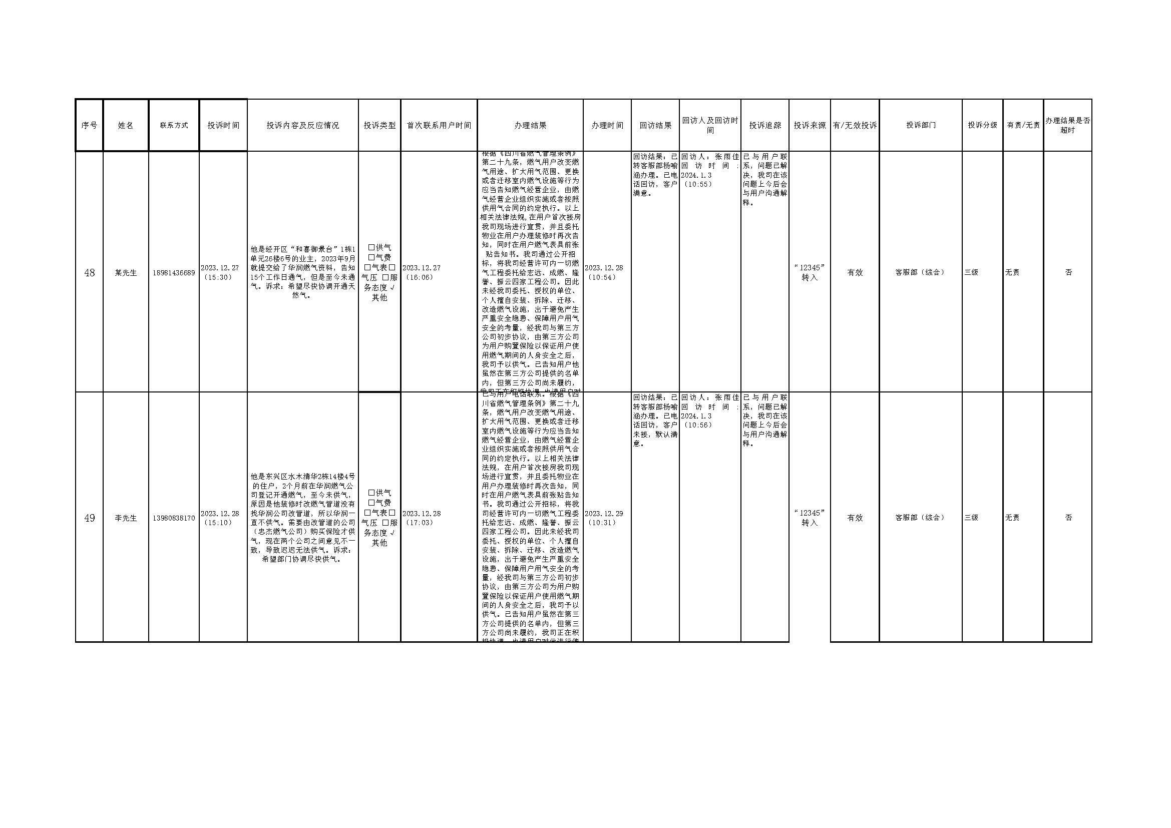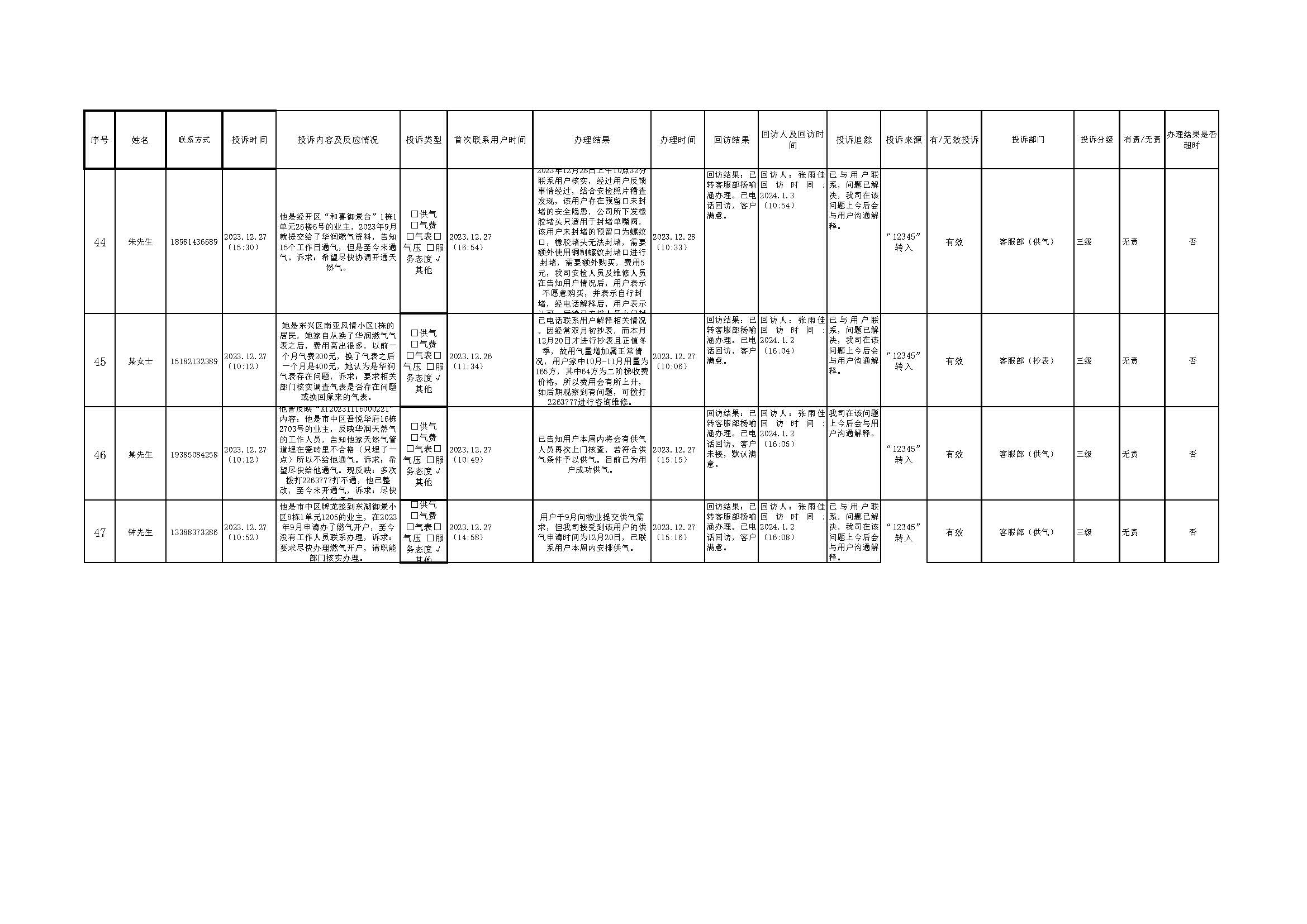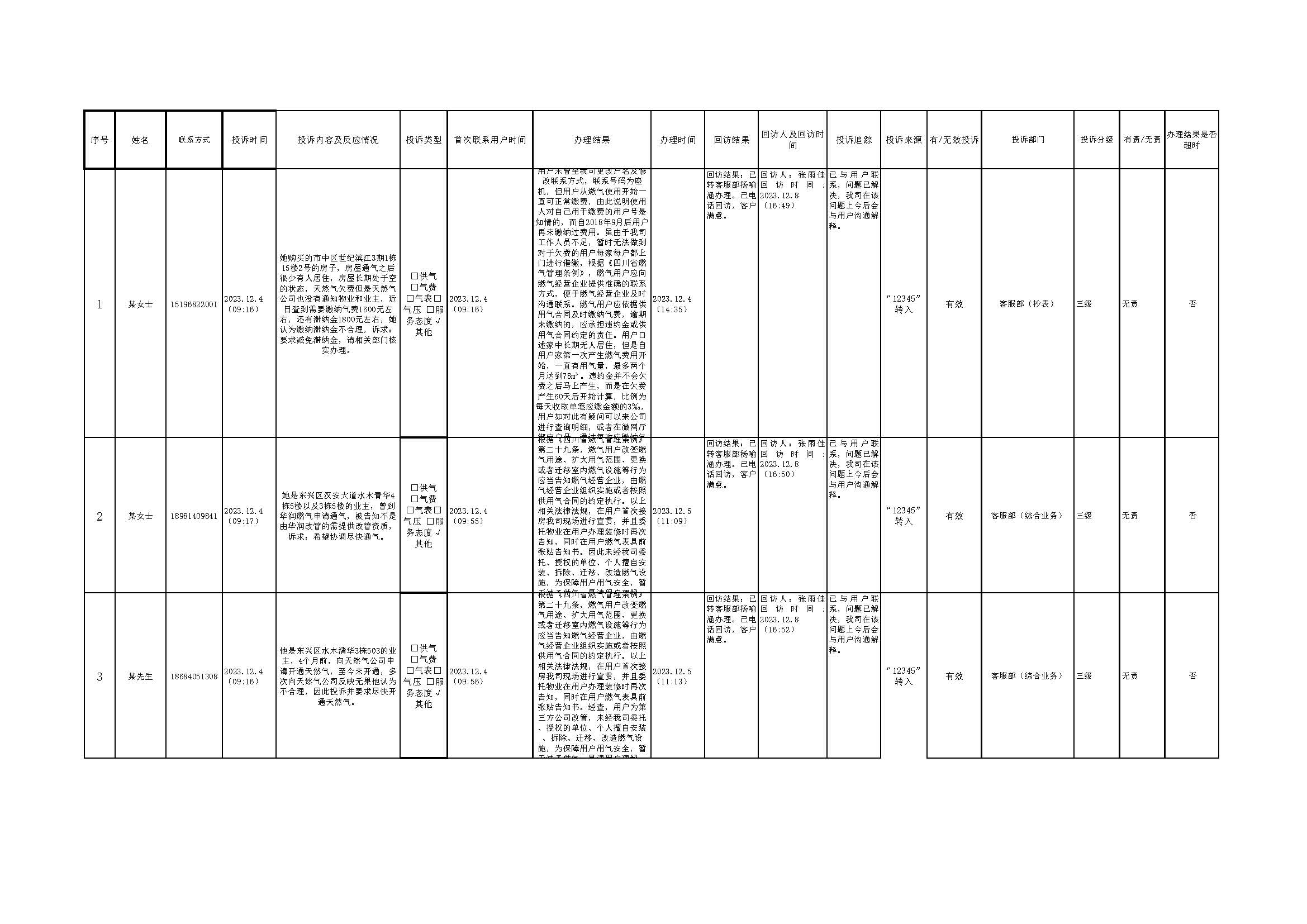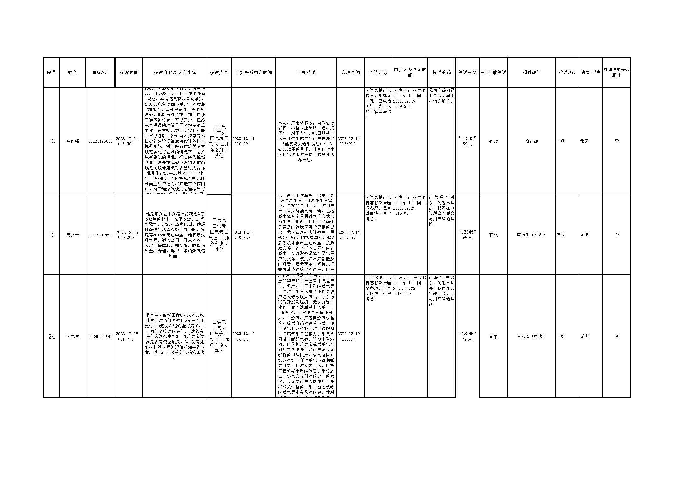 2023年12月投訴辦理及回訪情況