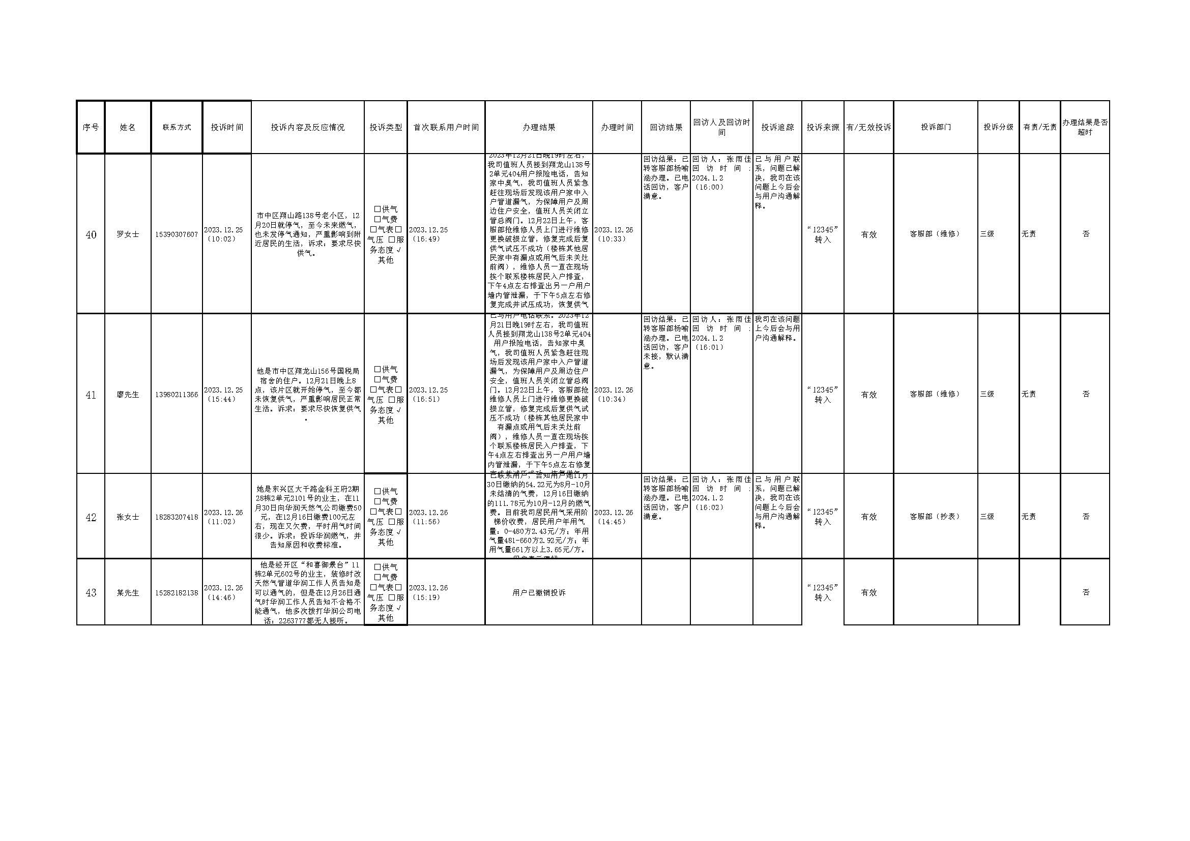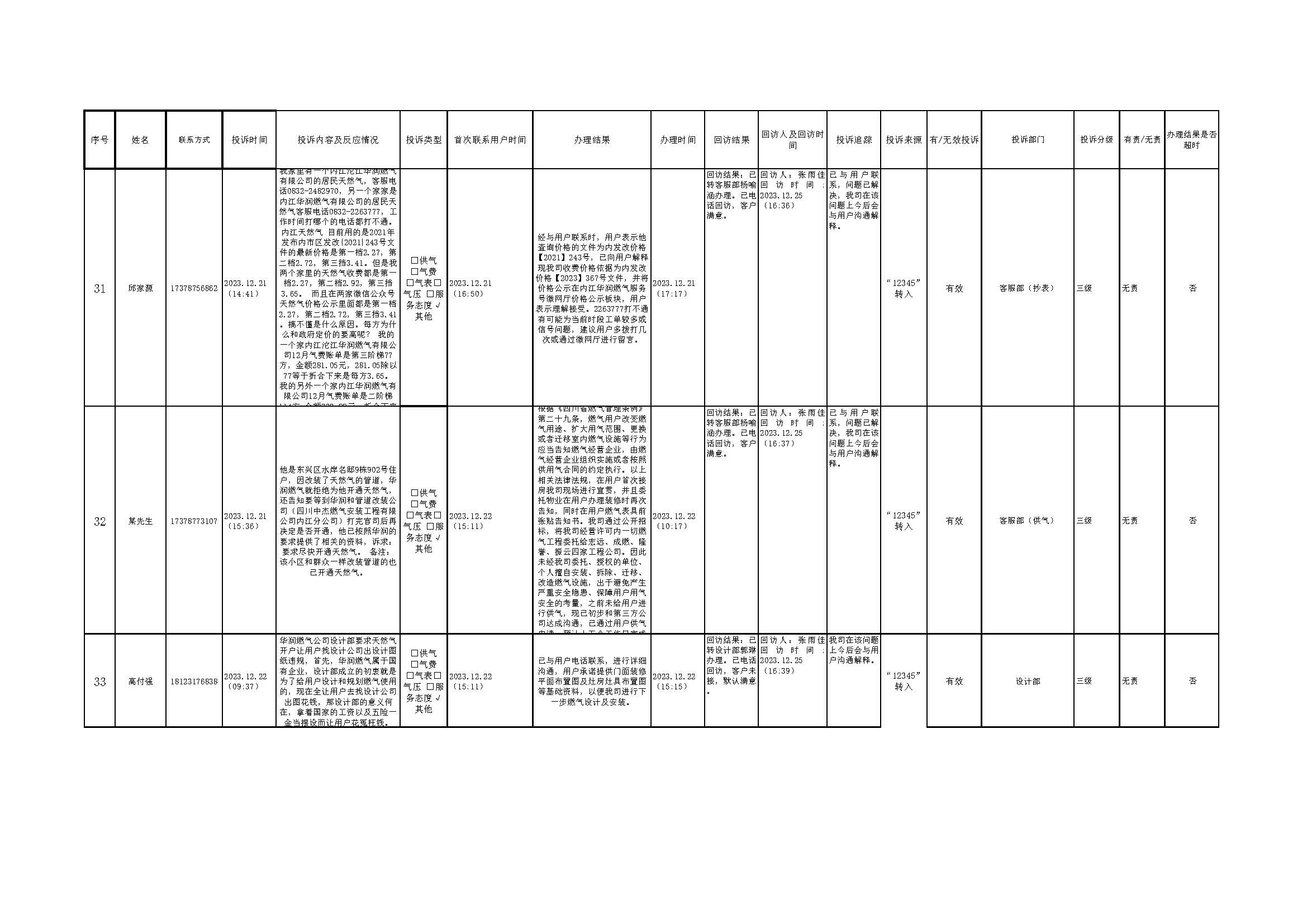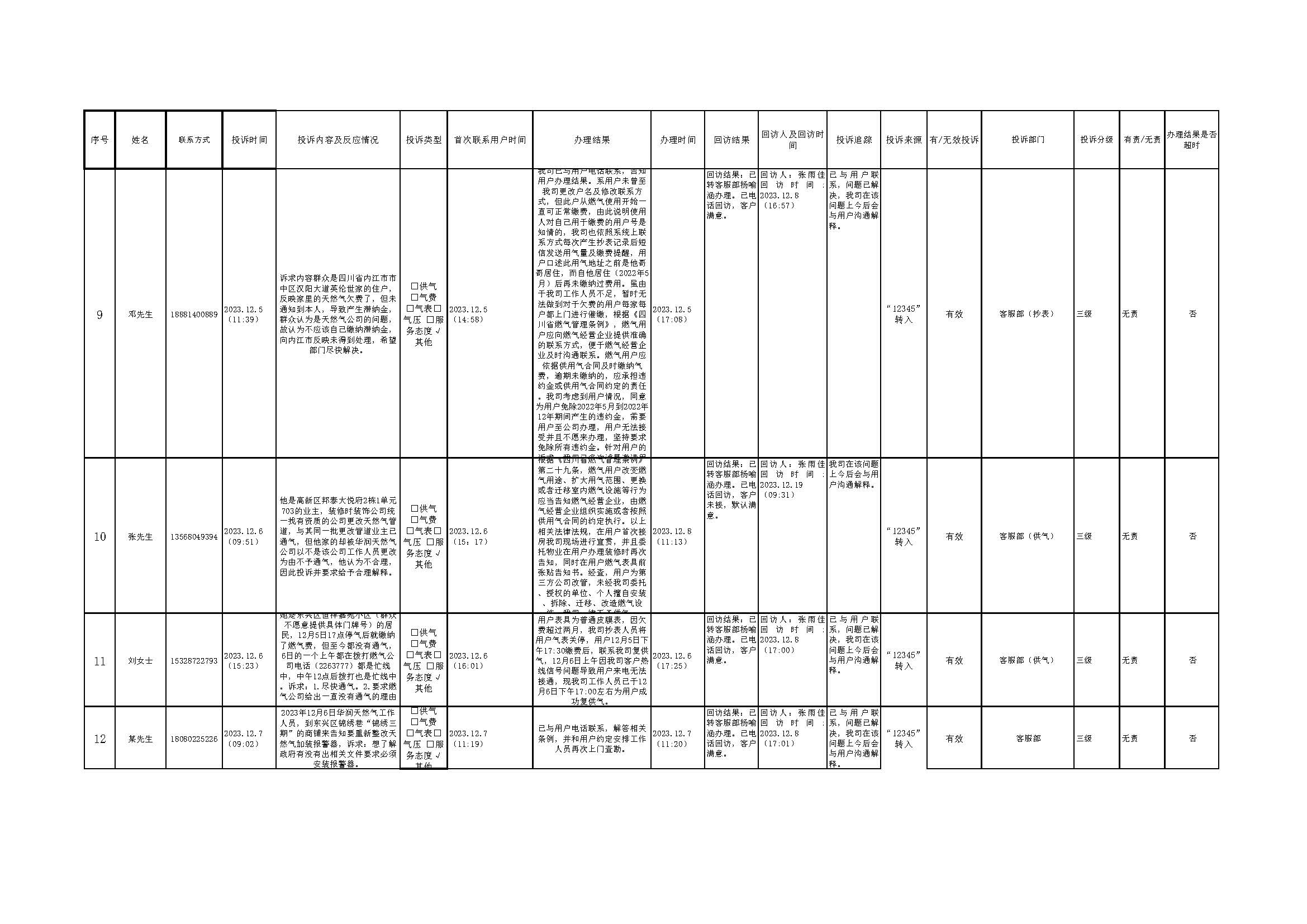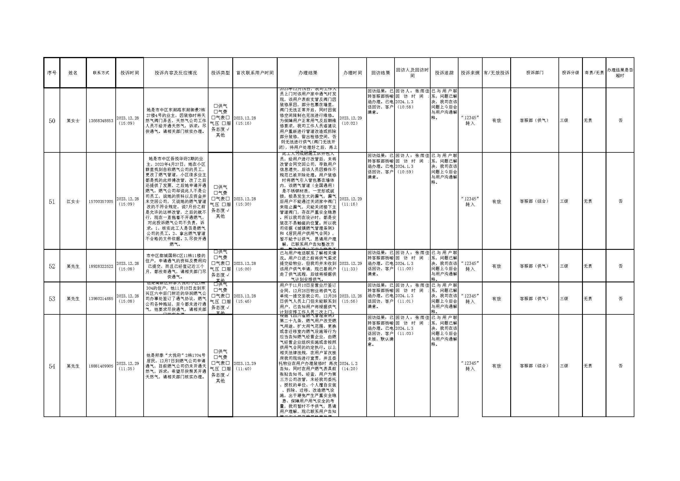 2023年12月投訴辦理及回訪情況