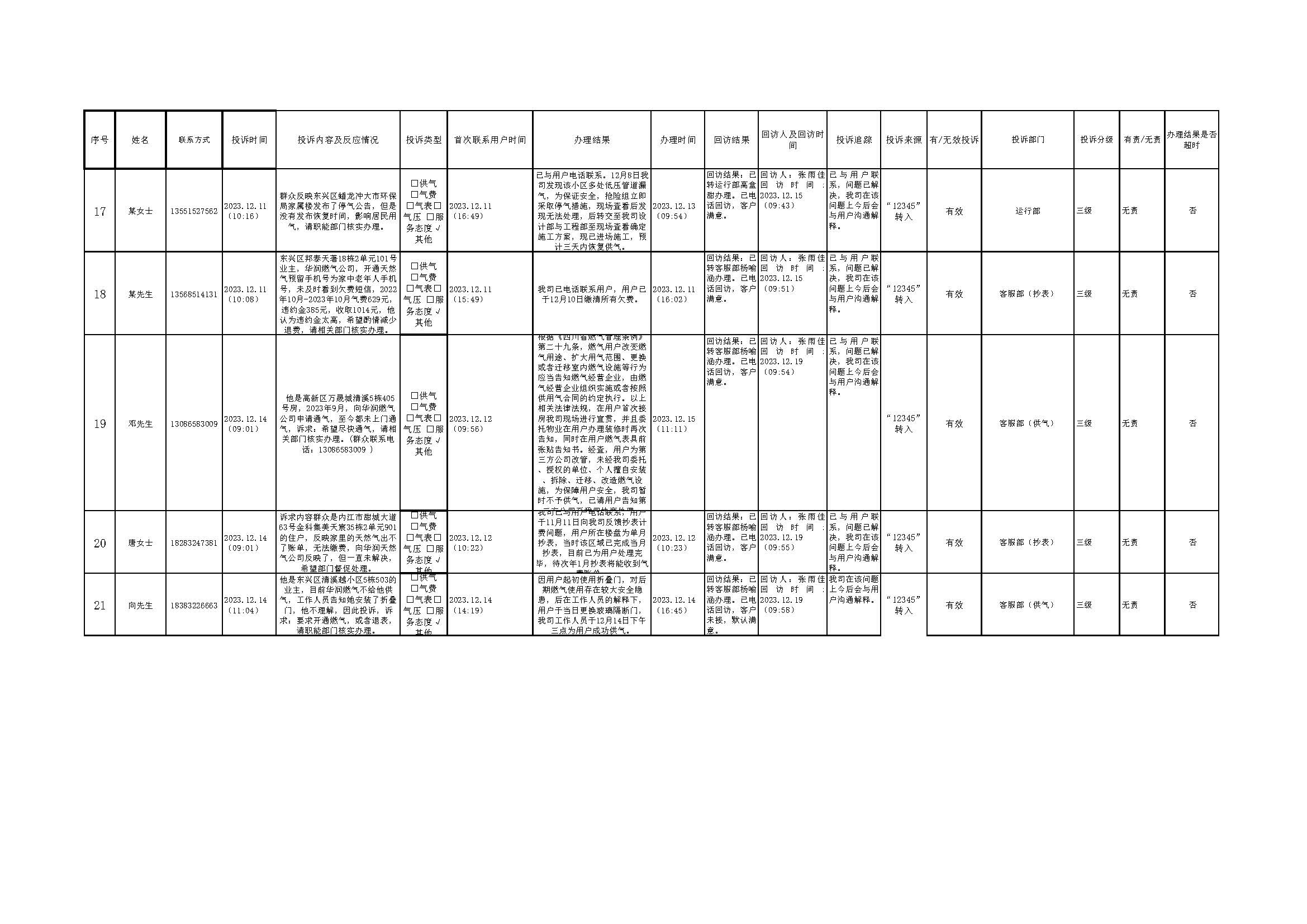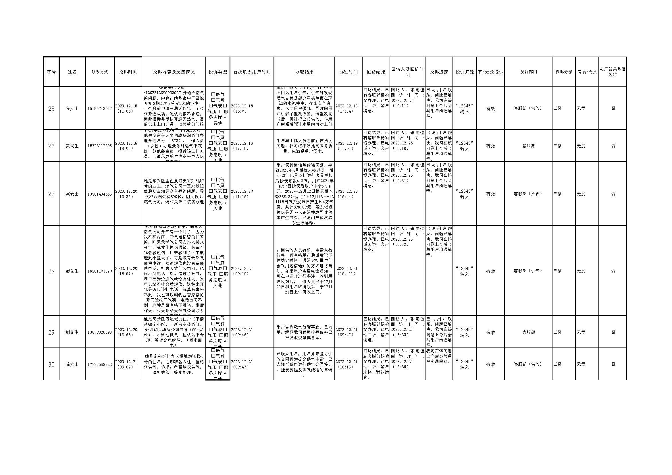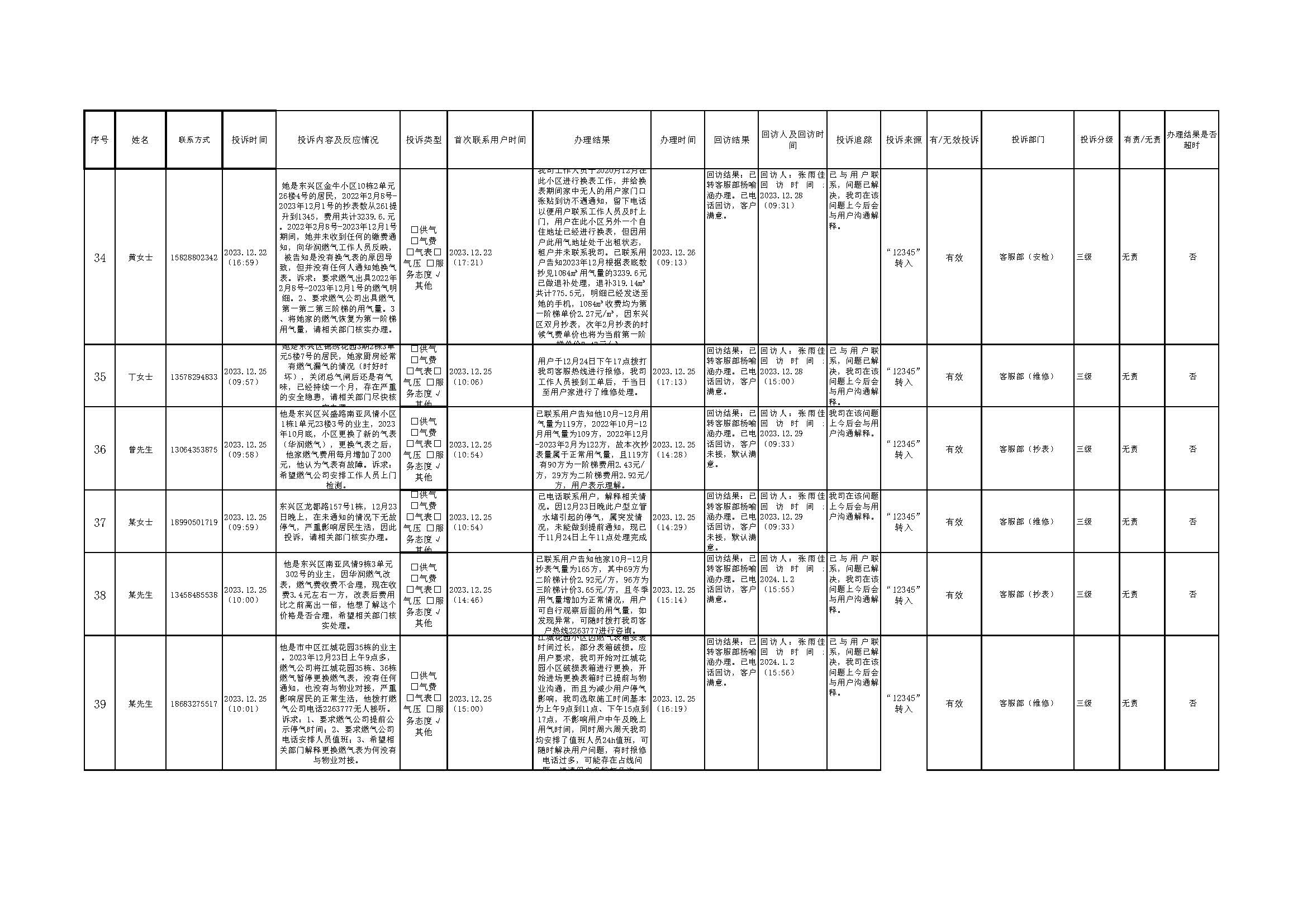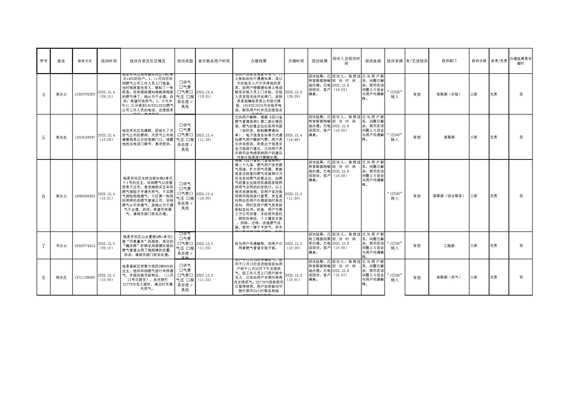 2023年12月投訴辦理及回訪情況