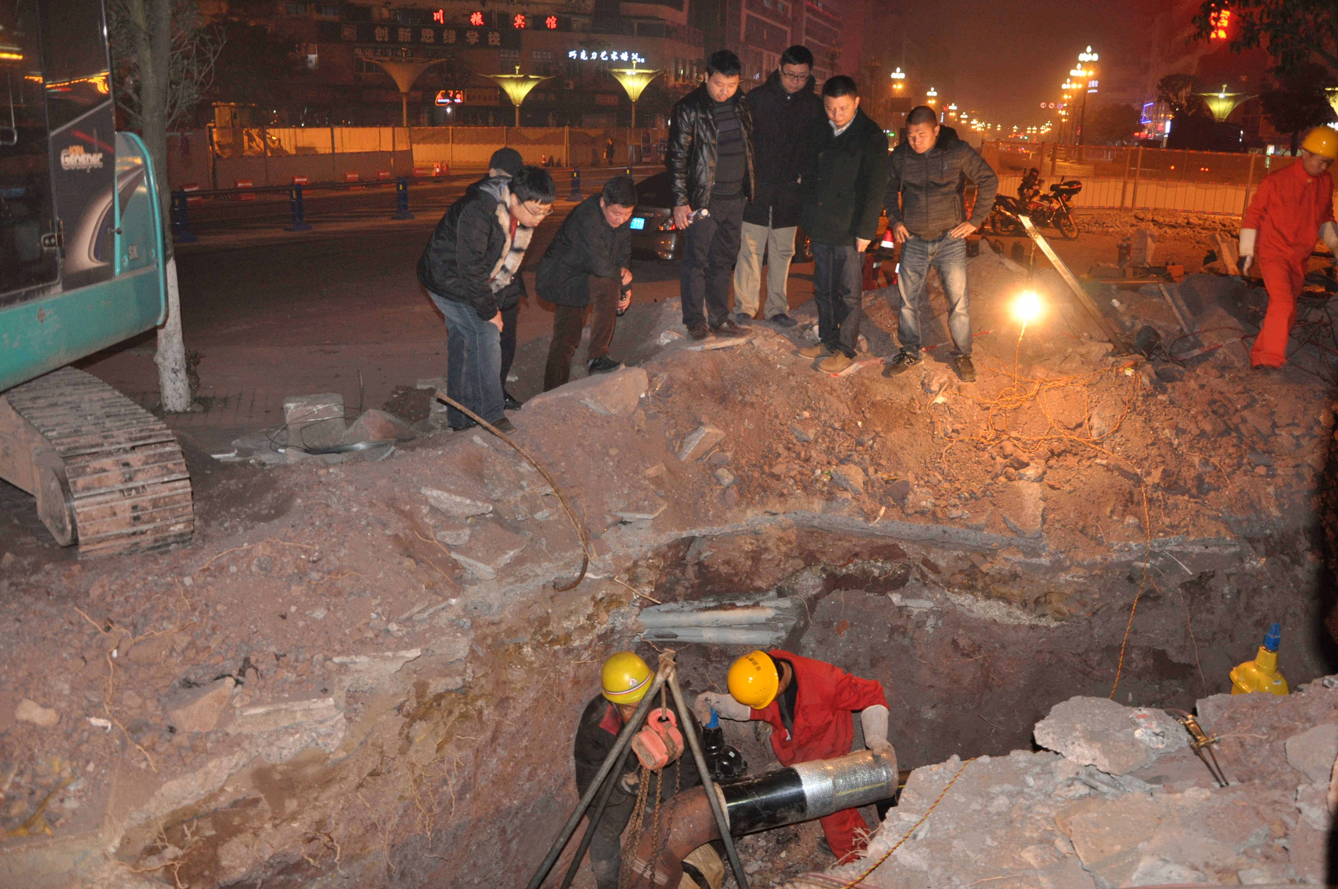 1月6日晚上22點(diǎn),不少人都已經(jīng)進(jìn)入夢(mèng)鄉(xiāng),太白路和東桐路交叉口依然人聲嘈雜,熱鬧非凡,公司30余名工作人員正在緊鑼密鼓的對(duì)地下燃?xì)夤艿肋M(jìn)行施工?,F(xiàn)場(chǎng),地下管道都已經(jīng)鋪設(shè)完畢,工作人員正在進(jìn)行最后的停氣碰接工作。
