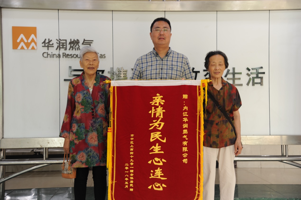 近日,內(nèi)江華潤燃?xì)庥邢薰居瓉砹藥孜话装l(fā)蒼蒼的老人,他們是上南街202號(hào)的住戶,專程為內(nèi)江華潤燃?xì)庥邢薰舅蛠砹祟}為“親情為民生心連心”的錦旗,感謝公司在總表改造工作中的惠民服務(wù)。